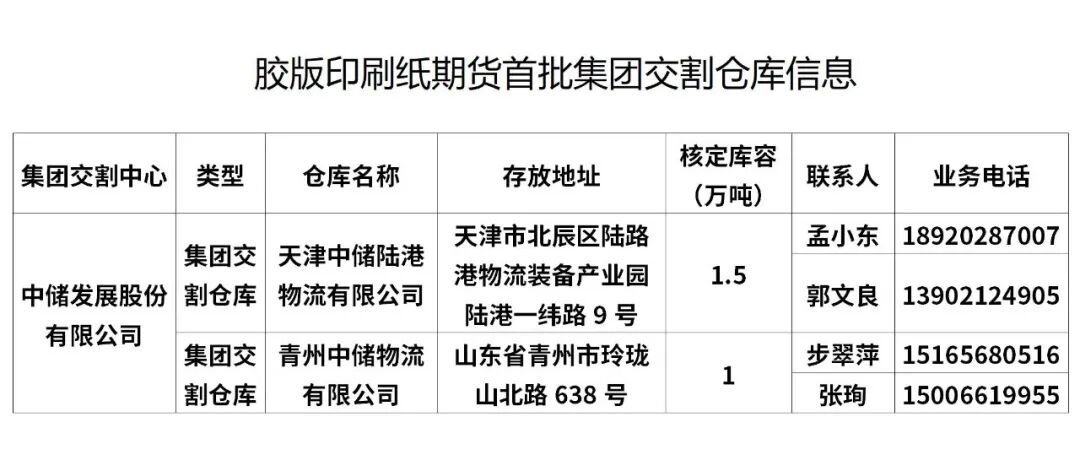 9月3日,上海期货交易所(上期所)发布公告,中国物流所属中储发展股份有限公司、天津中储陆港物流有限公司、青州中储物流有限公司成为胶版印刷纸期货首批集团交割中心、集团交割仓库,上海中储材料检验有限公司成为胶版印刷纸期货首批指定检验机构。